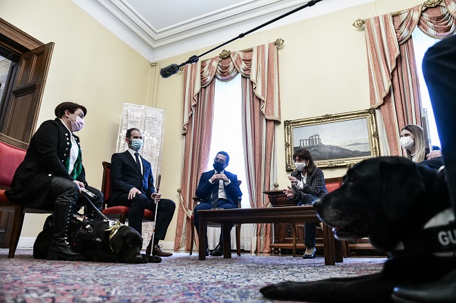 Με αφορμή την Παγκόσμια Ημέρα Ατόμων με Αναπηρία, η Πρόεδρος της Δημοκρατίας, Κατερίνα Σακελλαροπούλου, δέχθηκε στο Προεδρικό Μέγαρο πέντε άτομα με οπτική αναπηρία, τρία εκ των οποίων χρησιμοποιούν λευκό μπαστούνι και δύο σκύλο οδηγό.