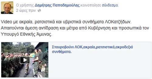 "Λοκατζής στο βουνό...μόνο αίμα, τι αίμα, τουρκικό, σκοπιανό, αλβανικό. Αίμα να ναι κι ότι να ναι". Σύνθημα στο στόμα λοκατζήδων στην Κύπρο, ανάμεσα σε άλλα, το ίδιο υβριστικά και προσβλητικά. (vid)