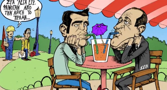 Επίσης, ακούγεται σε άλλο σημείο να λέγεται πως “θέλει τσαμπουκά να κάνεις πίσω στον πρώτο τσακωμό” δείχνοντας τον πρόεδρο του ΣΥΡΙΖΑ να μιλά στο Οικονομικό Ινστιτούτο και αμέσως μετά δύο φωτογραφίες από τους κυρίους Σαμαρά και Τσίπρα ενώ μιλάνε στο Σύνδεσμο Ελλήνων Βιομηχάνων.