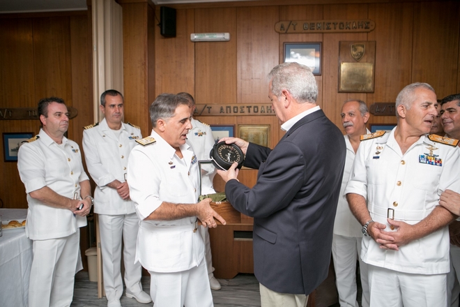 Αφού πήγε στα πολεμικά πλοία και στον ναυπηγοεπισκευαστικό τομέα του ναυστάθμου ανέβηκε μαζί με τον αρχηγό του Ναυτικού αντιναύαρχο Ευάγγελο Αποστολάκη και τον αρχηγό Στόλου αντιναύαρχο Παναγιώτη Λίτσα στην αίθουσα συσκέψεων. Εκεί είχαν συγκεντρωθεί οι διοικητές και οι επιτελείς του Στόλου προκειμένου να χαιρετήσουν τον υπουργό και του δώσουν δύο δώρα με ιδιαίτερους συμβολισμούς το καθένα.