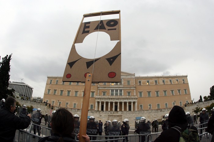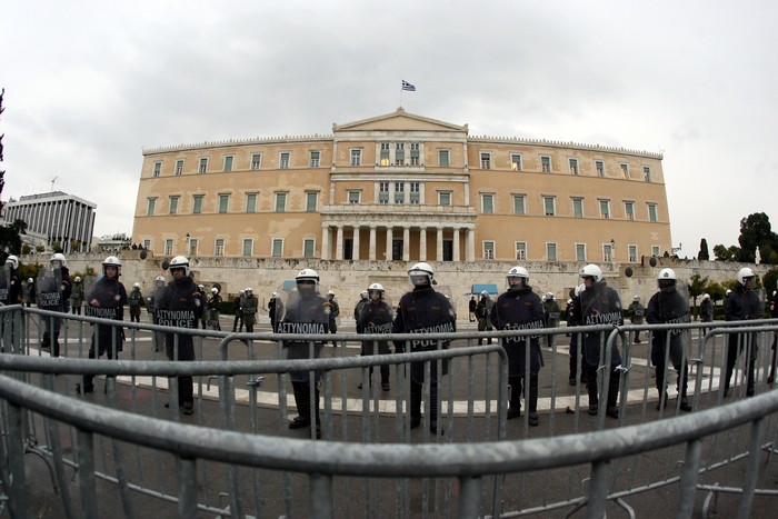 Οι διαδηλωτές διαμαρτύρονται για την ψήφιση του νομοσχεδίου, που θα θέσει σε εφαρμογή τις νέες μειώσεις σε μισθούς και συντάξεις, ελέω της νέας δανειακής σύμβασης.