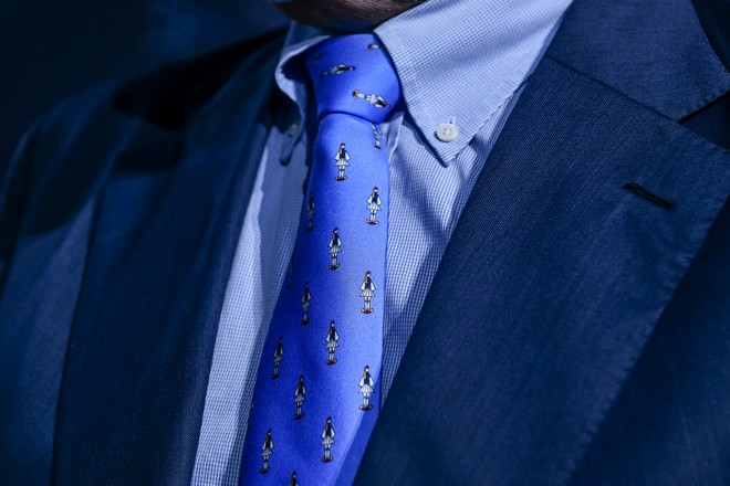Η γαλάζια γραβάτα του Κώστα Καραμανλή με τους τσολιάδες, που κέντρισε το ενδιαφέρον στο συνέδριο της Νέας Δημοκρατίας.