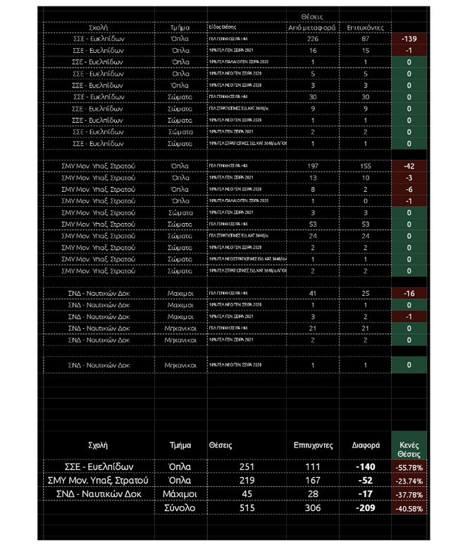 - 52 κενές θέσεις στη Σχολή Μονίμων Αξιωματικών (ΣΜΥ – Όπλα) που είναι το 23% των διαθέσιμων θέσεων (219)