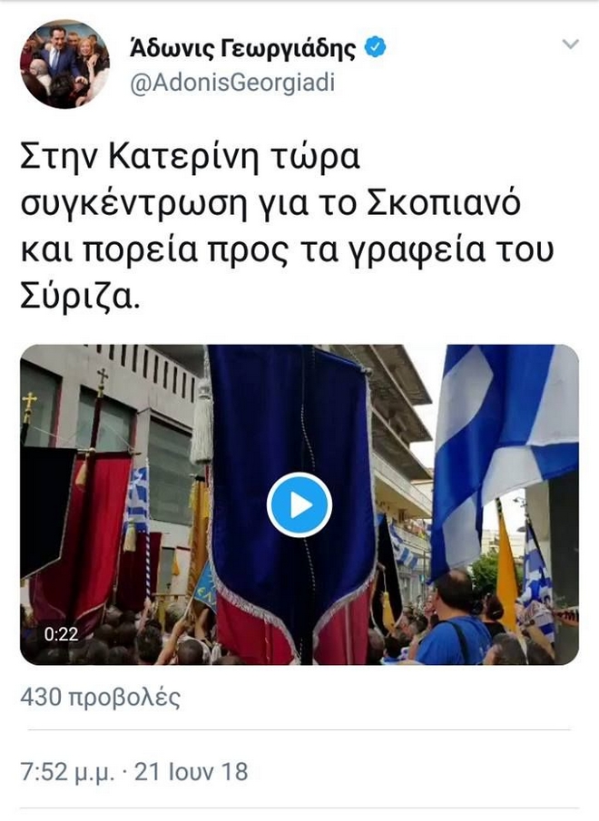 O κ.Γεωργιάδης πάντως απάντησε μέσω twitter σχολιάζοντας ότι δεν έχει την ικανότητα να μαζέψει μέσα σε λίγα δευτερόλεπτα κόσμο στην Κατερίνη και επιμένοντας ότι “ο κόσμος βράζει για την επαίσχυντη συμφωνία”.