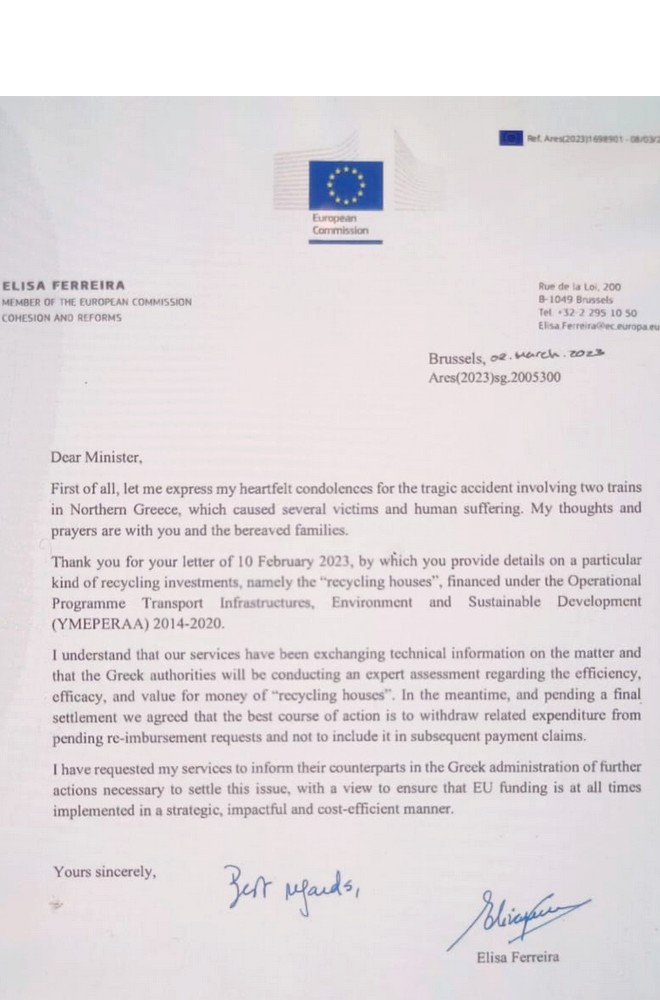“Η Ελλάδα αναδεικνύεται και πάλι σε μαύρο πρόβατο της Ευρώπης. Αυτή τη φορά για τα πολυκέντρα -τα περίφημα «σπιτάκια»- ανακύκλωσης. Όπως αποκάλυψε η Εφημερίδα των Συντακτών, η Κομισιόν με επιστολή της, αφήνει σαφείς αιχμές για αδιαφάνεια στην ανακύκλωση, αλλά και σοβαρά ζητήματα απόδοσης του εξοπλισμού και παγώνει την ευρωπαϊκή χρηματοδότηση για το έργο, ζητώντας τα ρέστα από τον άριστο Υπουργό Ανάπτυξης και την κυβέρνηση.