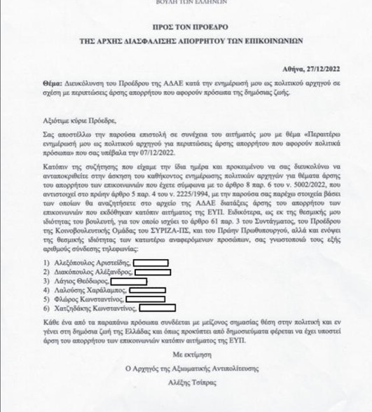 Από την Κουμουνδούρου τονίστηκε ότι “για την αξιοθρήνητη προσπάθεια του κ. Μητσοτάκη ακόμα και σήμερα να πείσει πως τα ονόματα των 6 παρακολουθούμενων (Χατζηδάκη, Φλώρου, Λαλούση, Διακόπουλου, Λάγιου και Αλεξόπουλου) δεν τα γνώριζε και δεν ήταν στην απαντητική επιστολή του κ. Ράμμου, δημοσιοποιούμαι το επίσημο αίτημα που είχε υποβάλλει ο κ. Τσίπρας στον Πρόεδρο της ΑΔΑΕ.