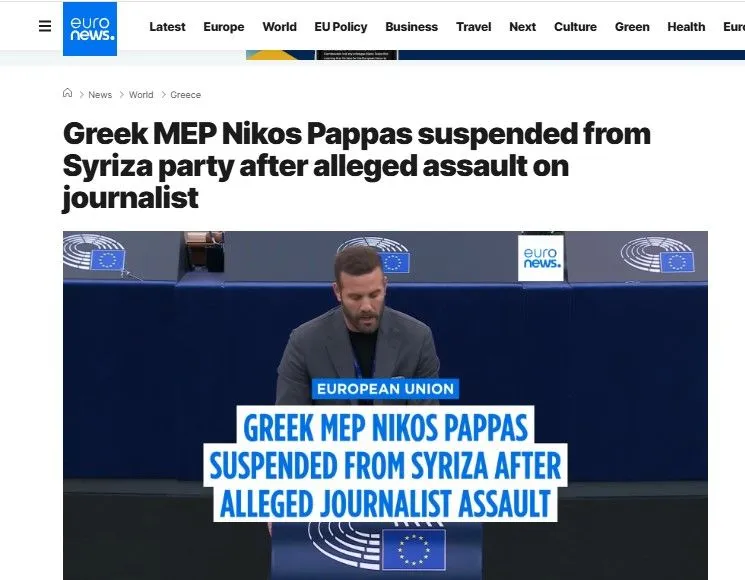“Ο Έλληνας ευρωβουλευτής Νίκος Παππάς διεγράφη από τον ΣΥΡΙΖΑ μετά από φερόμενη επίθεση σε δημοσιογράφο”, τιτλοφορεί το άρθρο του Euronews, στο οποίο αποτυπώνονται αναλυτικά τα γεγονότα, βάσει της καταγγελίας του θύματος.
