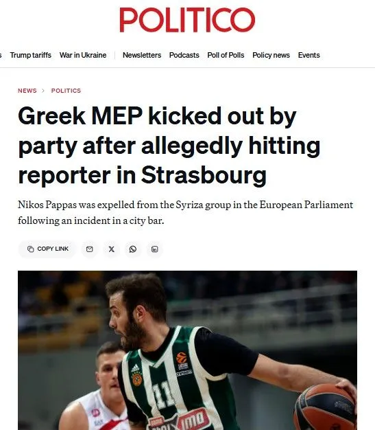 “Έλληνας ευρωβουλευτής αποβάλλεται από το κόμμα του μετά από φερόμενη επίθεση σε δημοσιογράφο στο Στρασβούργο”, είναι ο τίτλος του άρθρου που δημοσιεύεται στο Politico.