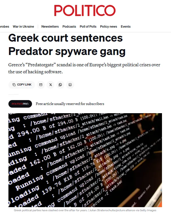 Το BBC λέει πως στην υπόθεση που έγινε γνωστή ως «το Watergate της Ελλάδας», λογισμικό παρακολούθησης με την ονομασία Predator χρησιμοποιήθηκε για τη στοχοποίηση 87 προσώπων — μεταξύ αυτών υπουργών, ανώτατων στρατιωτικών αξιωματούχων και δημοσιογράφων.