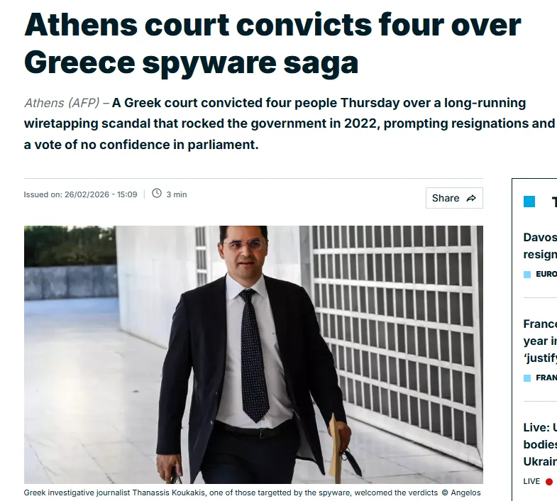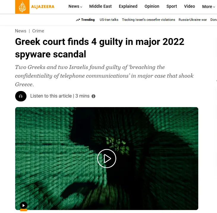Aπό πλευρά του, το Al Jazeera σημειώνει πως ελληνικό δικαστήριο καταδίκασε τέσσερα άτομα, μεταξύ των οποίων δύο Ισραηλινούς, σε ποινές φυλάκισης για το μεγάλο σκάνδαλο υποκλοπών που αφορούσε την παράνομη χρήση του λογισμικού Predator με στόχο δεκάδες πολιτικούς, δημοσιογράφους, επιχειρηματίες και στρατιωτικούς αξιωματούχους.