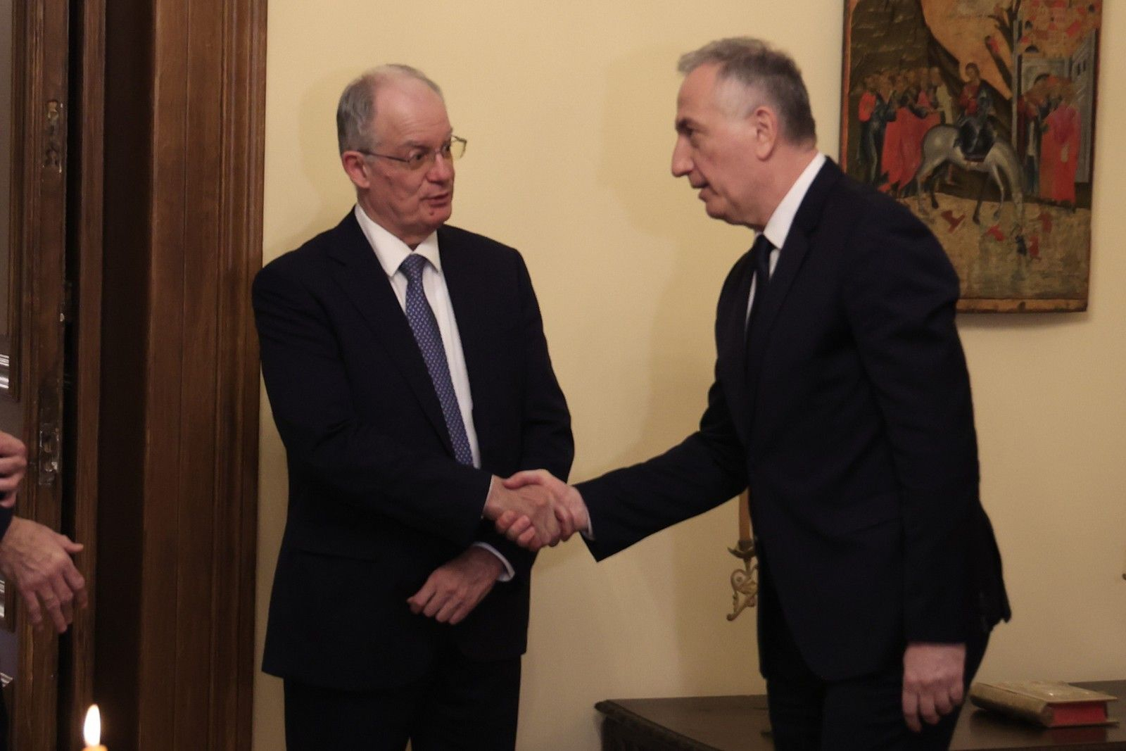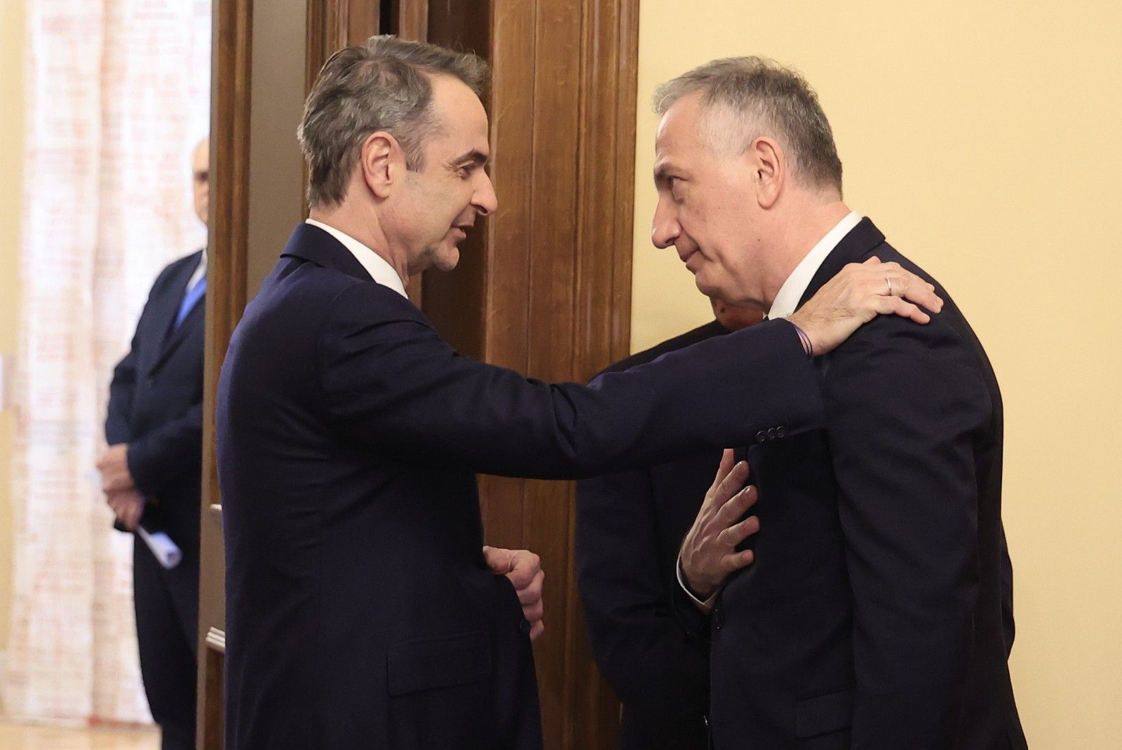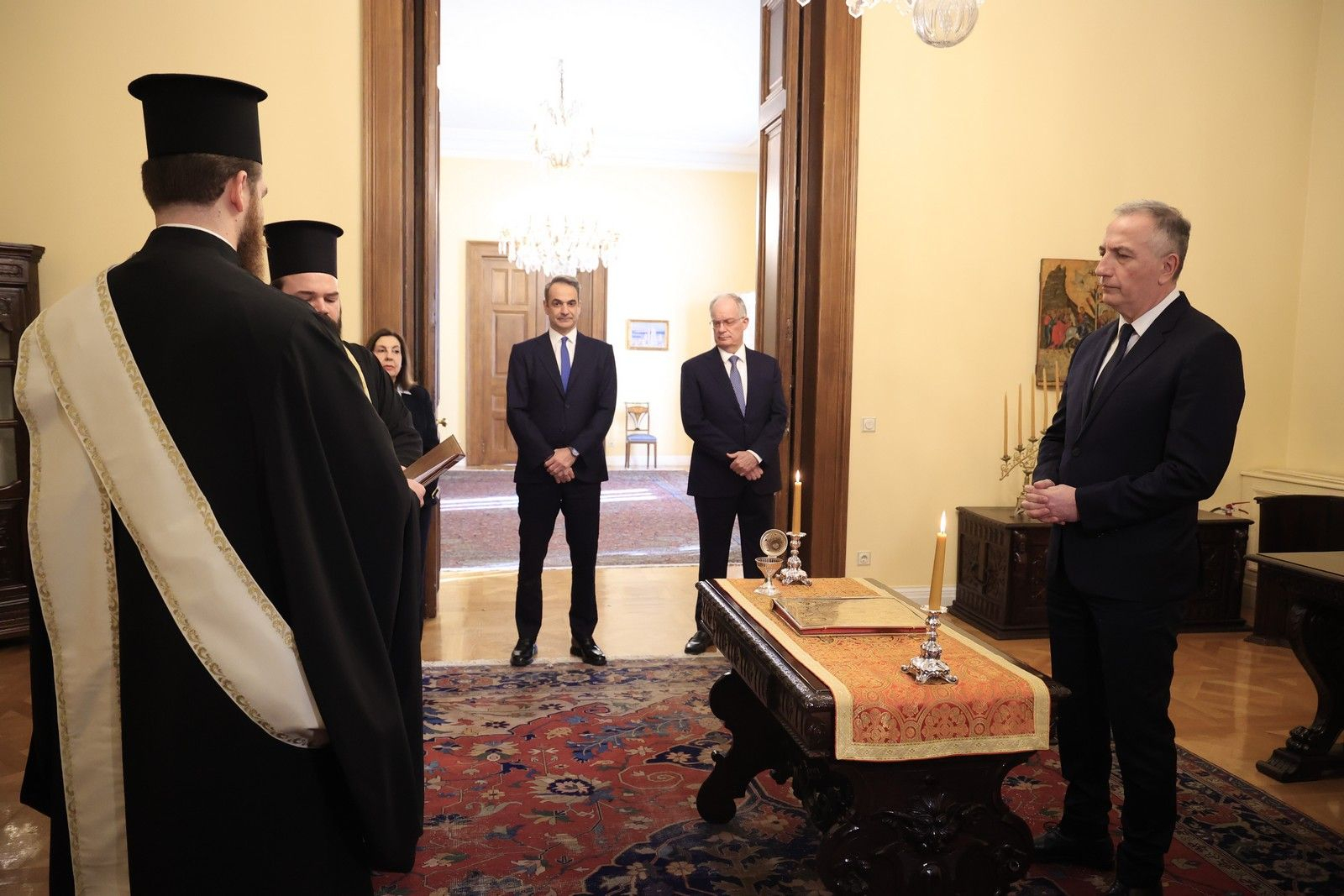 Ο Σταύρος Καλαφάτης ορκίστηκε από τον Αρχιγραμματέα της Ιεράς Συνόδου Αρχιμανδρίτη Ιωάννη Καραμούζη, ενώπιον του Προέδρου της Δημοκρατίας Κωνσταντίνου Τασούλα και παρουσία του Κυριάκου Μητσοτάκη.
