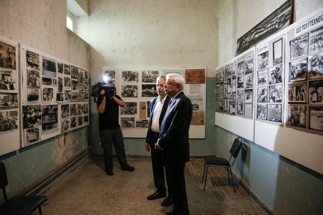 Ο κ. Παυλόπουλος ξεναγήθηκε από τον πρόεδρο του Συνδέσμου Φυλακισθέντων και Εξορισθέντων Αντιστασιακών της επταετίας, Κώστα Μανταίο, στον χώρο του πρώην στρατοπέδου “ΕΑΤ-ΕΣΑ” και στα κελιά όπου βασανίστηκαν οι αντιστασιακοί Σπύρος Μουστακλής και Αλέκος Παναγούλης.