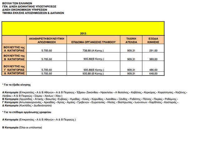 Αργά το βράδυ της Δευτέρας, με εντολή του προέδρου της Βουλής, Ευάγγελου Μεϊμαράκη, αναρτήθηκε στην ιστοσελίδα του κοινοβουλίου από την διεύθυνση οικονομικών υπηρεσιών της Βουλής, πίνακας ο οποίος αναγράφει την ακαθάριστη βουλευτική αποζημίωση, το επίδομα οργάνωσης γραφείου, την ταχυδρομική ατέλεια και τα έξοδα κίνησης για το 2013.