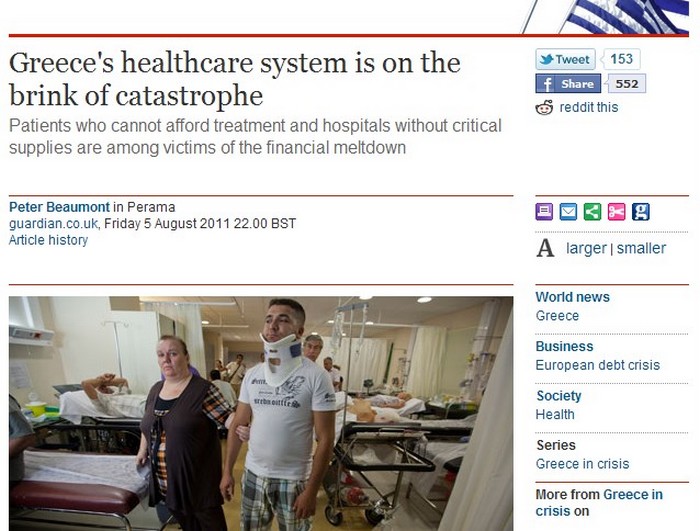 Σε άρθρο του, ο Guardian, τονίζει πως το σύστημα υγείας στη Ελλάδα βρίσκεται στο χείλος του γκρεμού ενώ το χαρακτηρίζει ως “γραφειοκρατικό εφιάλτη”, λόγω των άπειρων δικαιολογητικών που πρέπει να συμπληρωθούν.