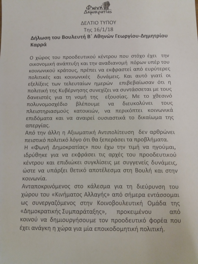 Με δήλωσή του ο βουλευτής που εκλέγεται στη Β’ Αθηνών ανακοίνωσε ότι ανταποκρίνεται στο κάλεσμα για τη διεύρυνση του χώρου του «Κινήματος Αλλαγής» προκειμένου «από κοινού να δημιουργήσουμε τον προοδευτικό φορέα που έχει ανάγκη η χώρα για μια εποικοδομητική πολιτική. Σημείωσε, επίσης, ότι ο χώρος του προοδευτικού κέντρου «πρέπει να εκφραστεί από ευρύτερες πολιτικές και κοινωνικές δυνάμεις. «Η “Φωνή Δημοκρατίας” που έχω την τιμή να ηγούμαι ιδρύθηκε για να εκφράσει τις αρχές του προοδευτικού κέντρου και να επιδιώκει συγκλίσεις με συγγενείς δυνάμεις ώστε να υπάρξει θετικό αποτέλεσμα στη Βουλή και την κοινωνία», συμπλήρωσε.