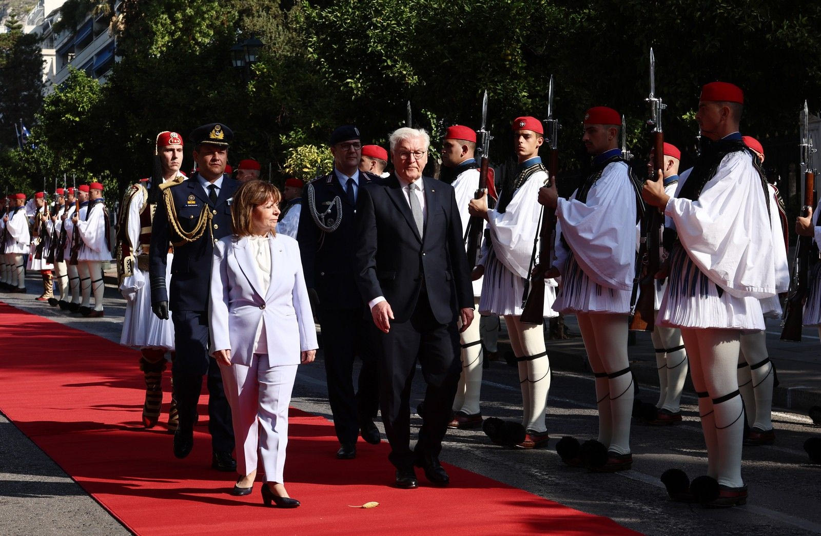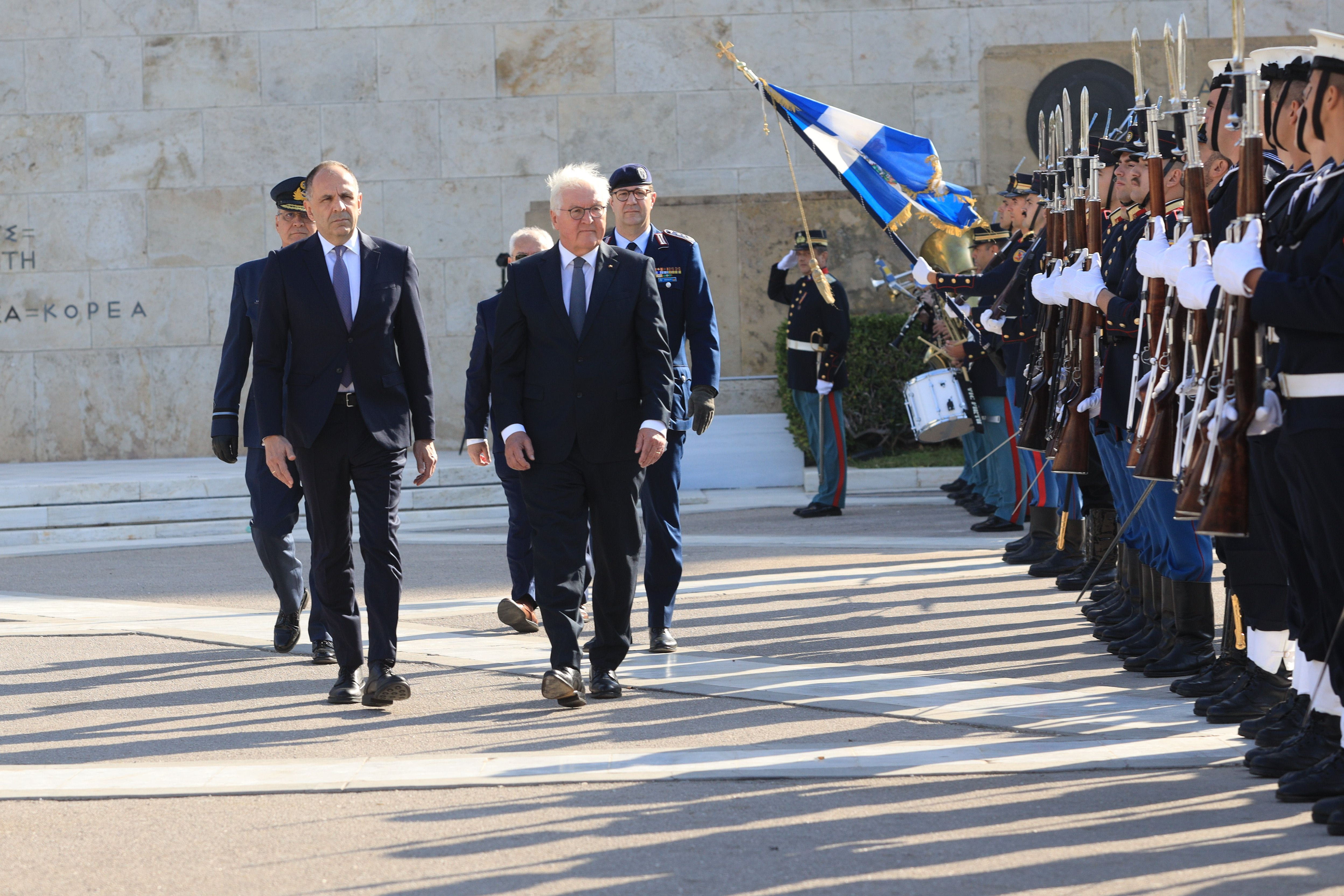 Ο κ. Σταϊνμάιερ έγινε δεκτός στο Προεδρικό Μέγαρο με στρατιωτικές τιμές ενώ νωρίτερα είχε καταθέσει στεφάνι στο Μνημείο του Άγνωστου Στρατιώτη.