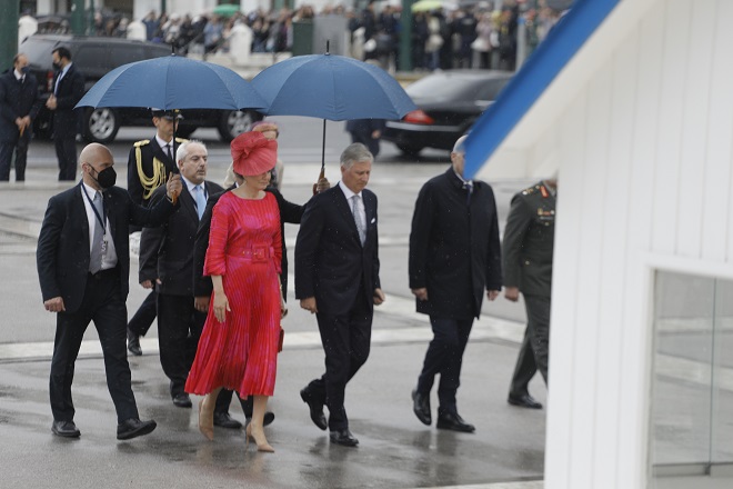 Ο βασιλιάς Φίλιππος και η βασίλισσα Ματθίλδη κατευθύνονται στο Προεδρικό Μέγαρο, όπου αρχικά θα λάβει χώρα η επίσημη τελετή υποδοχής, η ανάκρουση των Εθνικών Ύμνων και η παρουσίαση των αντιπροσωπειών. Λόγω των δυσμενών καιρικών συνθηκών, η τελετή υποδοχής θα πραγματοποιηθεί εντός του Προεδρικού Μεγάρου και όχι επί της Ηρώδου Αττικού.