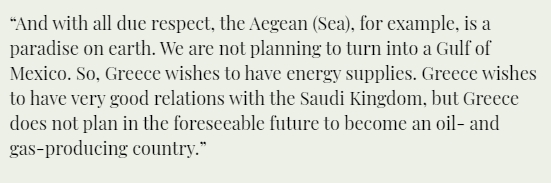 “Χρειαζόμαστε 10 ή 20 χρόνια για να το βρούμε και να το εκμεταλλευτούμε και θα ήταν πολύ πιο κοστοβόρο σχετικά με μια αντίστοιχη διαδικασία, όπως για παράδειγμα στη Σαουδική Αραβία. Έτσι, από οικονομικής σκοπιάς, δεν οραματίζομαι την Ελλάδα να γίνει χώρα παραγωγής πετρελαίου”.