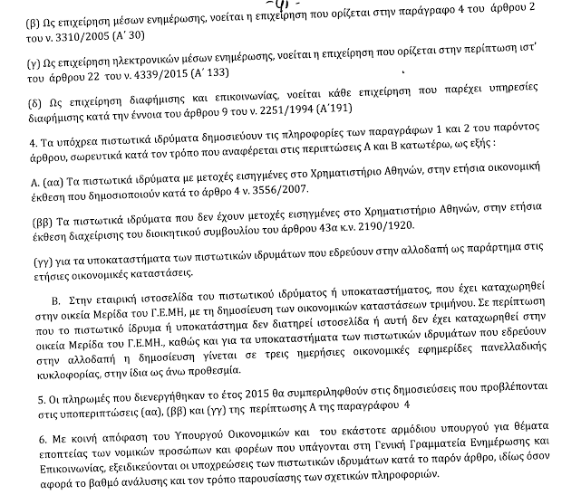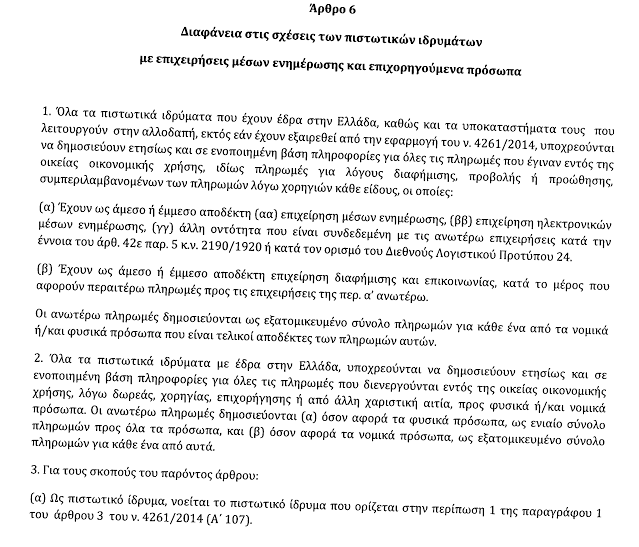 -Όλα τα πιστωτικά ιδρύματα που έχουν έδρα στην Ελλάδα, καθώς και τα υποκαταστήματά τους υποχρεούνται να δημοσιεύουν ετησίως και σε ενοποιημένη βάση πληροφορίες για όλες τις πληρωμές που έγιναν εντός της οικείας οικονομικής χρήσης, ιδίως πληρωμές για λόγους διαφήμισης, προβολής ή προώθησης συμπεριλαμβανομένων των πληρωμών λόγω χορηγιών.