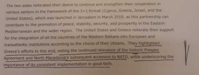 Στο κείμενο που υπάρχει τώρα στην επίσημη σελίδα του Ελληνικού ΥΠΕΞ εμπεριέχεται η φράση:They highlighted Greece’s efforts to this end, noting the continued relevance of the Prespes Agreement and North Macedonia’s subsequent accession to NATO, while underscoring the importance of its consistent implementation in good faith.