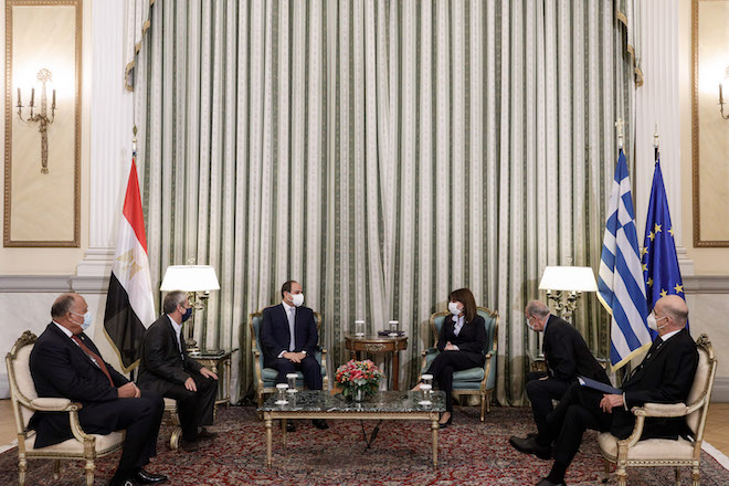 Κατά την συνάντηση της Αικ. Σακελλαροπούλου με τον Πρόεδρο της Αιγύπτου αλ Σίσι, στο επίκεντρο των συζητήσεων βρέθηκε η συμφωνία για μερική οριοθέτηση της ΑΟΖ και η αναζωπύρωση φαινομένων τρομοκρατίας