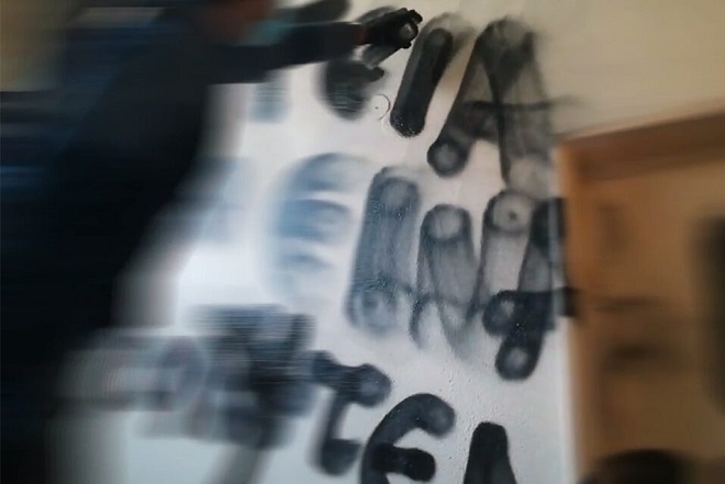 Συνθήματα στο σπίτι του υπουργού Επικρατείας, Άκη Σκέρτσου, έγραψαν με σπρέι μέλη της αναρχικής συλλογικότητας “Ρουβίκωνας“.