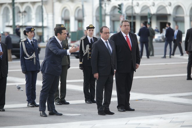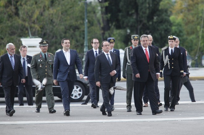 Ο πρωθυπουργός Αλέξης Τσίπρας υποδέχεται τον Πρόεδρο της Γαλλίας Φρανσουά Ολάντ την Πέμπτη 22 Οκτωβρίου 2015. Ο Φρανσουά Ολάντ επισκέπτεται επίσημα την Ελλάδα έως και το βράδυ της Παρασκευής και θα έχει συναντήσεις με την πολιτική και Πολιτειακή ηγεσία της χώρας. (EUROKINISSI/ΣΤΕΛΙΟΣ ΜΙΣΙΝΑΣ) Eurokinissi