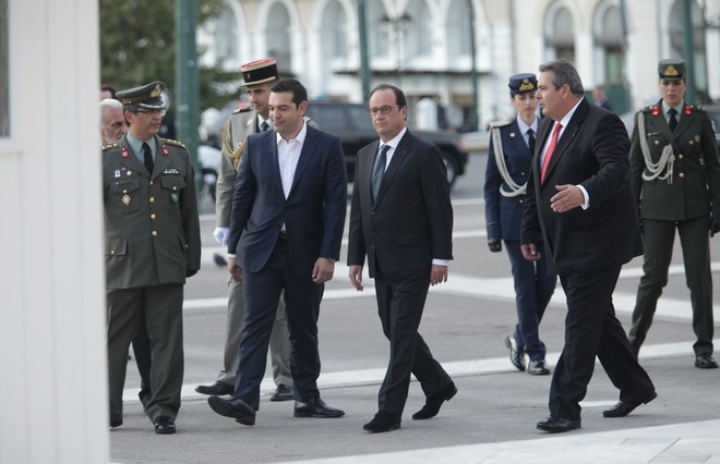 Ολάντ και Τσίπρας πριν αποχωρήσουν από το αεροδρόμιο με κατεύθυνση την πλατεία Συντάγματος, όπου τον Γάλλο πρόεδρο αναμένεται να υποδεχθεί ο υπουργός Άμυνας, Πάνος Καμμένος.