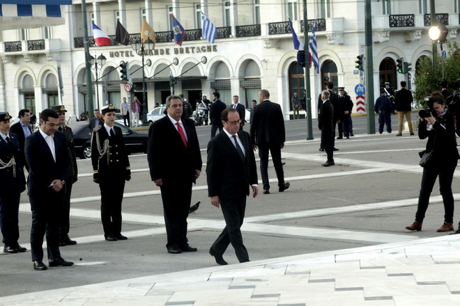 Ο Γάλλος πρόεδρος κατέθεσε στεφάνι στο Μνημείο του Αγνώστου Στρατιώτη και αποχωρεί, συνοδευόμενος πάντα από τον πρωθυπουργό, κατευθυνόμενος στο Προεδρικό Μέγαρο.