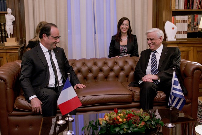 Ο πρόεδρος της Δημοκρατίας Προκόπης Παυλόπουλος (Δ) συνομιλεί με τον πρόεδρο της Γαλλίας Φρανσουά Ολάντ (Α), κατά τη διάρκεια της συνάντησής τους, την Πέμπτη 22 Οκτωβρίου 2015, στο Προεδρικό Μέγαρο. (POOL/ΑΠΕ-ΜΠΕ/ΑΛΕΞΑΝΔΡΟΣ ΜΠΕΛΤΕΣ) Eurokinissi