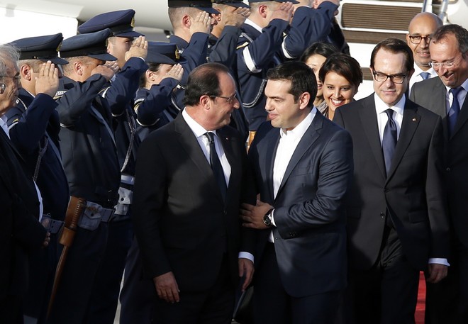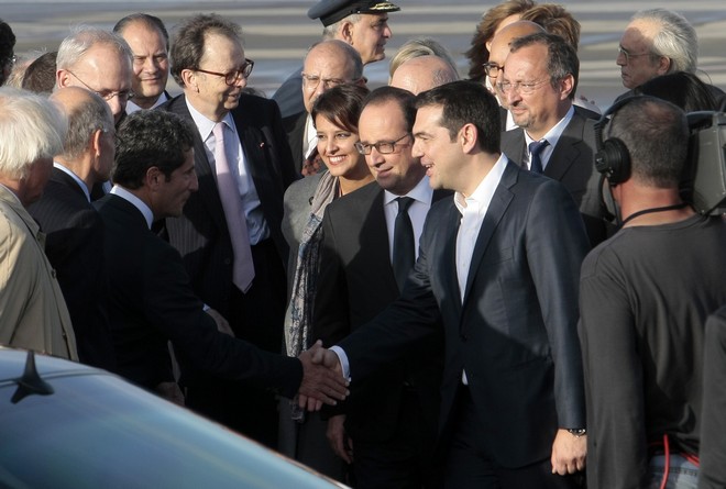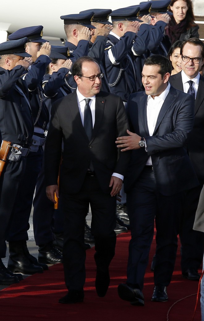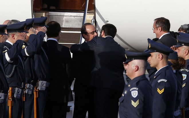 Ο Έλληνας πρωθυπουργός Αλέξης Τσίπρας επιφύλαξε θερμή υποδοχή στον Γάλλο πρόεδρο, Φρανσουά Ολάντ και τους συνεργάτες του στο αεροδρόμιο της Αθήνας.