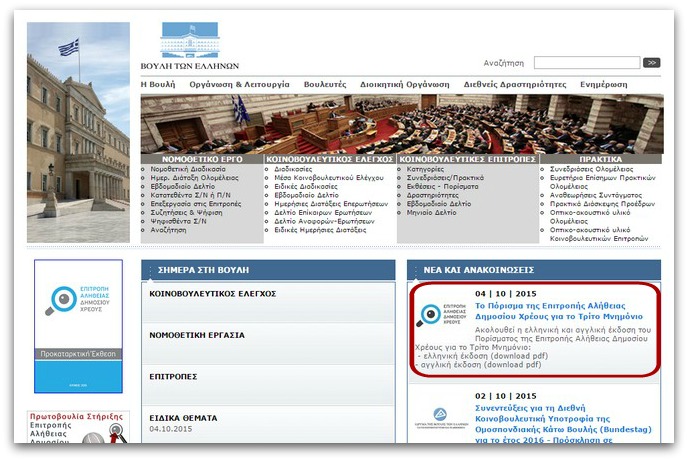 Στον ιστότοπο της βουλής των Ελλήνων αναρτήθηκε το πρωί της 4ης Οκτωβρίου το πόρισμα της επιτροπής Αλήθειας για το χρέος, σχετικά με το τρίτο μνημόνιο που ψήφισε η κυβέρνηση ΣΥΡΙΖΑ. Όλα αυτά την ώρα που στο κοινοβούλιο οι βουλευτές ψήφιζαν νέο πρόεδρο της Βουλής