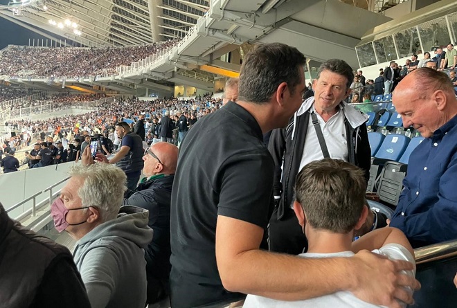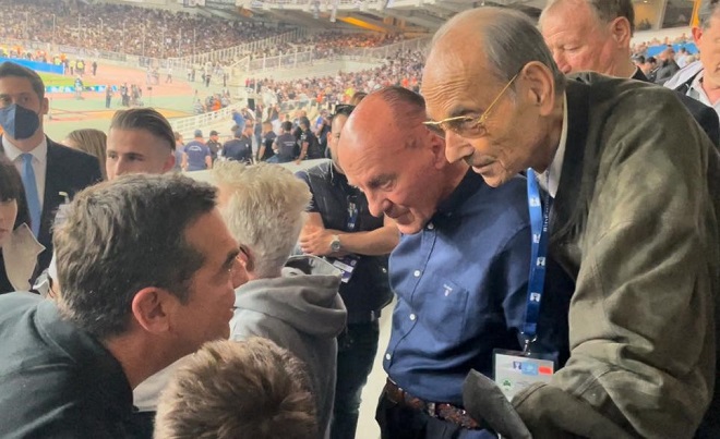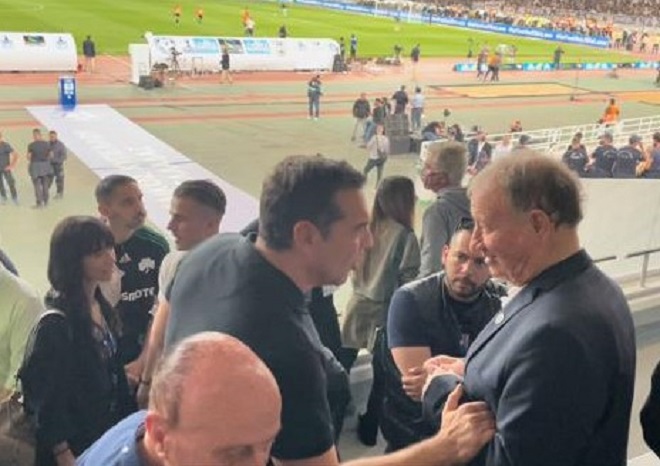 Στις κερκίδες του ΟΑΚΑ, ο Αλέξης Τσίπρας είχε την ευκαιρία να μιλήσει και με παλαίμαχους ποδοσφαιριστές που βρέθηκαν στο γήπεδο. Ένας εξ αυτών ήταν και ο Σταύρος Σαράφης, παλαίμαχος διεθνής που πέρασε όλη την επαγγελματική του καριέρα στον ΠΑΟΚ.