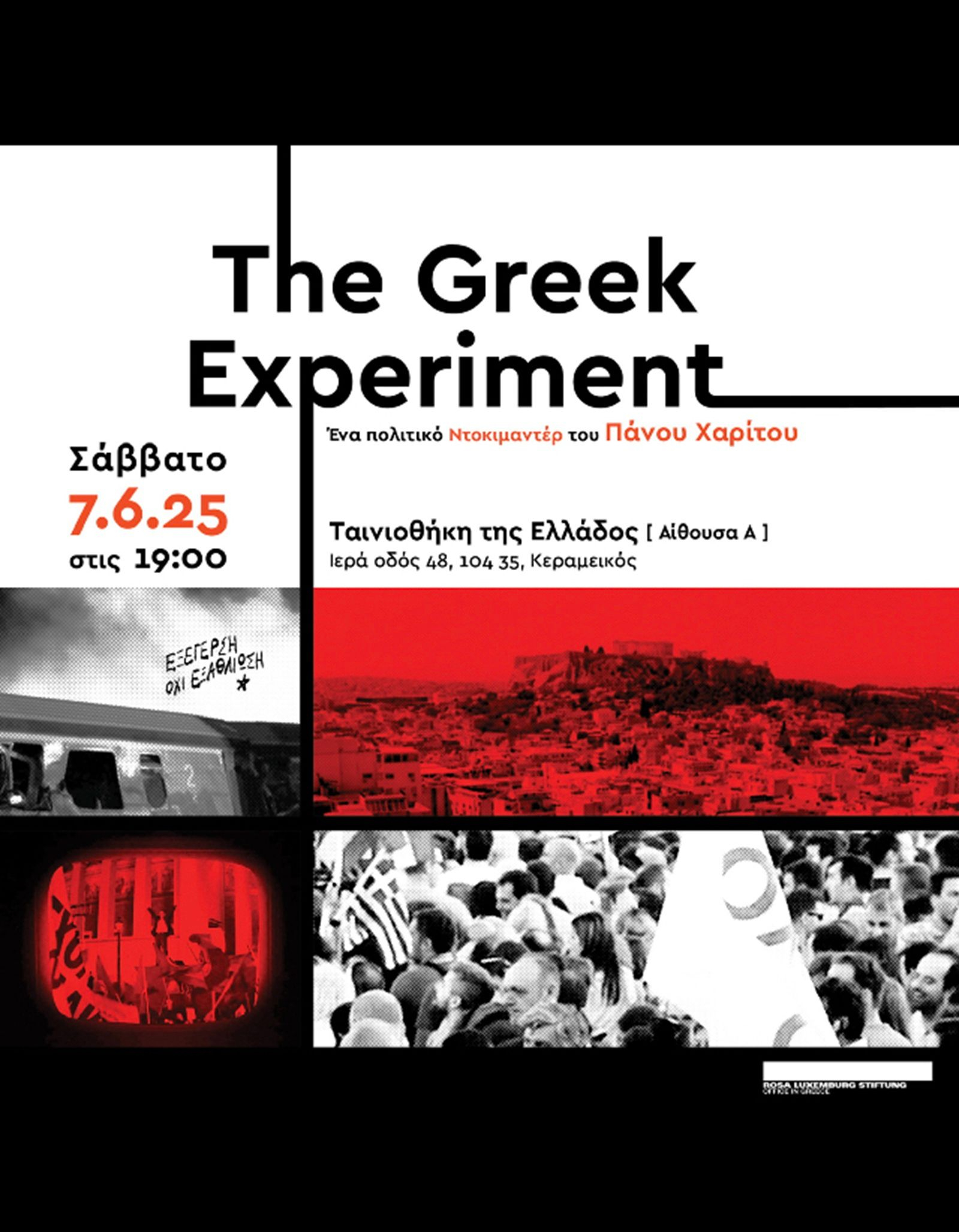 Πρεμιέρα κάνει το νέο πολιτικό ντοκιμαντέρ “The Greek Experiment”  του Πάνου Χαρίτου στη Ταινιοθήκη της Ελλάδας.