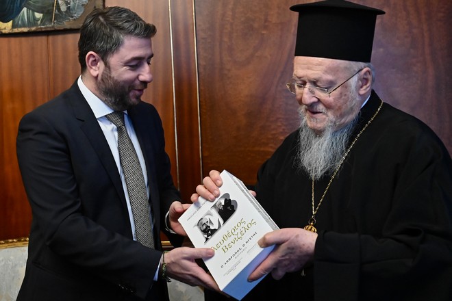 Ο πρόεδρος του ΠΑΣΟΚ – Κινήματος Αλλαγής δώρισε στον Οικουμενικό Πατριάρχη την πρώτη έκδοση του βιβλίου «Ελευθέριος Βενιζέλος: Ο άνθρωπος, ο ηγέτης» του Νικ. Εμμ. Παπαδάκη καθώς και την έκδοση του Μουσείου Μπενάκη, «Σχέδια εργασίας των ζωγράφων μετά την ‘Αλωση. Ο φάκελος Ανδρέα Ξυγγόπουλου».