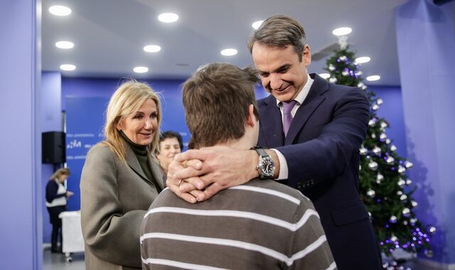 Στον πρόεδρο της ΝΔ έψαλλαν τα κάλαντα και παιδιά με σύνδρομο Down, στα οποία μοίρασε δώρα και είχε την ευκαιρία να συνομιλήσει με τις μητέρες τους.