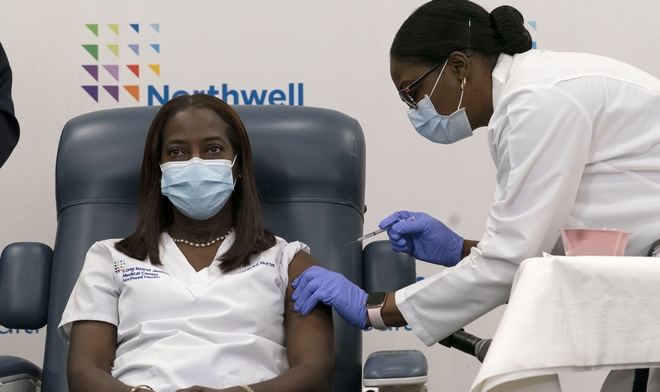 Η νοσηλεύτρια Sandra Lindsay κάνει το εμβόλιο της Pfizer AP