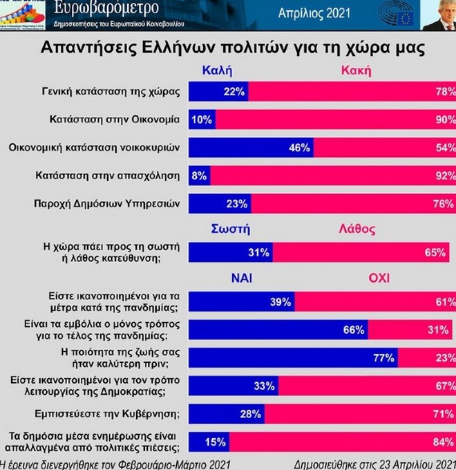 -Το 78% των πολιτών στην Ελλάδα πιστεύουν πως η γενική κατάσταση στην χώρα είναι κακή. (5η χειρότερη επίδοση στην Ε.Ε.)