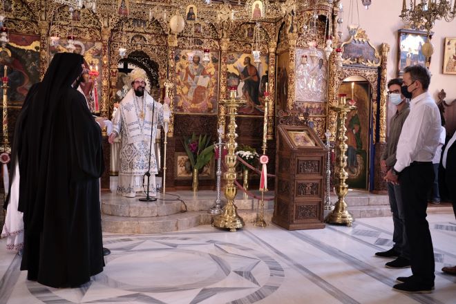 Ο Κυριάκος Μητσοτάκης σε δεκάδες φωτογραφίες που κυκλοφόρησαν στο διαδίκτυο εμφανίζεται να συνομιλεί με ιερείς που δεν φορούν μάσκα. Επίσης να παρακολουθεί την διαδικασία της Θείας Μετάληψης από δεκάδες πιστούς σε κλειστό χώρο, στην εκκλησία της Μονής. Οι πιστοί, παρότι φορούν στην πλειοψηφία τους μάσκα, την αφαιρούν και στέκονται στην ουρά για να μεταλάβουν με ότι αυτά τα δύο σημαίνουν για τις πιθανότητες διάδοσης του Covid 19, ενώ παρατηρείται και σχετικός συνωστισμός. Αυτά μερικές μέρες μετά την τελετή ορκωμοσίας στο Μέγαρο Μαξίμου, που ακολούθησε τον ανασχηματισμό της 4ης Αυγούστου, στην οποία οι ιερείς ορκίζουν τους υπουργούς δίχως και αυτοί να φορούν μάσκα.