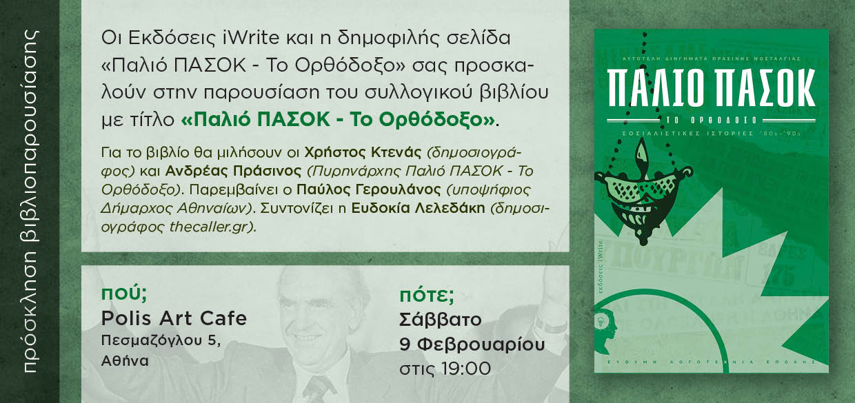 “Οι εκδόσεις iwrite, η σελίδα Παλιό ΠΑΣΟΚ το Ορθόδοξο και δεκάδες σύντροφοι λογοτέχνες του σοσιαλισμού, σας προσκαλούν σε μία ανεπανάληπτη παρουσίαση του συλλογικού βιβλίου “Παλιό ΠΑΣΟΚ – Το Ορθόδοξο: Σοσιαλιστικές Ιστορίες 80s – 90s”.