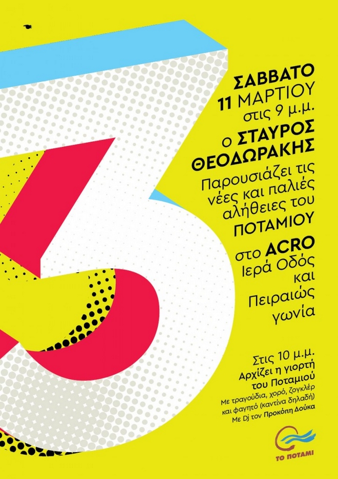 Οι εκδηλώσεις για τα τρία χρόνια του Ποταμιού θα κορυφωθούν το Σάββατο 11 Μαρτίου στις 7 το απόγευμα στο Acro, με ομιλία του επικεφαλής Σταύρου Θεοδωράκη.