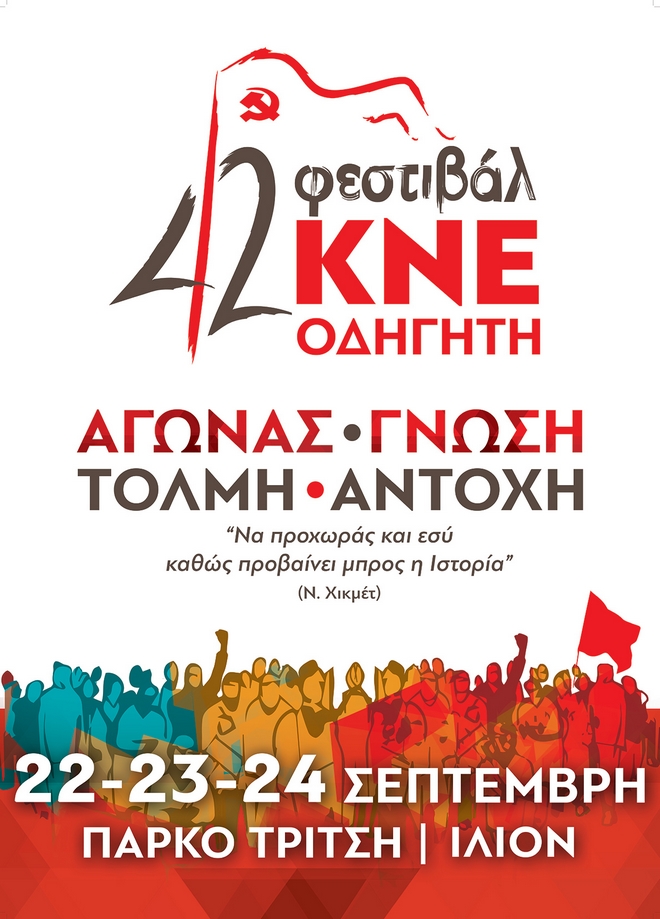 Με σύνθημα «Αγώνας, Γνώση, Τόλμη, Αντοχή “Να προχωράς κι εσύ, καθώς προβαίνει μπρος η Ιστορία!” (Ναζίμ Χικμέτ)» κορυφώνονται σε όλες τις μεγάλες πόλεις της Ελλάδας οι εκδηλώσεις του 42 Φεστιβάλ ΚΝΕ – «Οδηγητή».