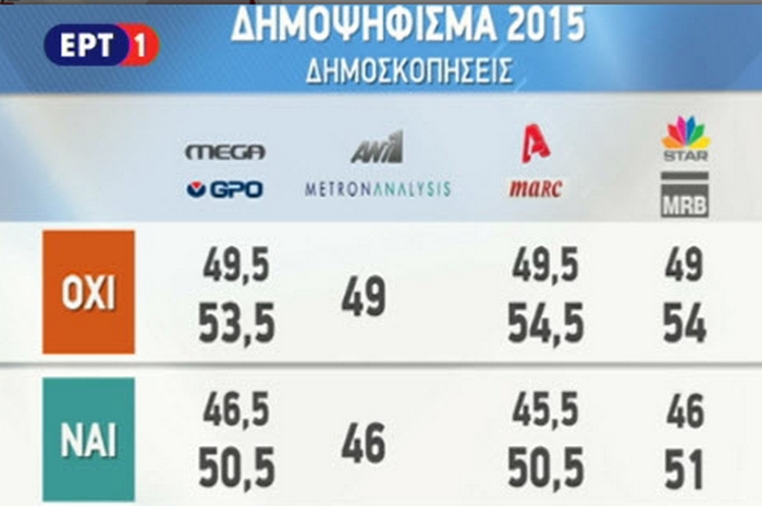 Έξω έπεσαν οι δημοσκόποι καθώς στις δημοσκοπήσεις των 19:00 οι τελικές εκτιμήσεις για το δημοψήφισμα έδειχνε το ΟΧΙ να κυμαίνεται από 49%-54,9% και το ΝΑΙ από 45,5%-50,5%.