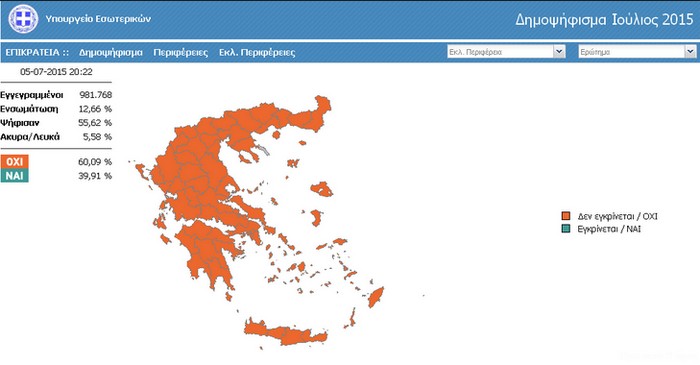 Σύμφωνα όμως με τα τελικά αποτελέσματα η εικόνα αλλάζει κατά πολύ καθώς η διαφορά του ΟΧΙ με το ΝΑΙ είναι σαρωτική. Συγκεκριμένα, με ενσωματωμένο το 100% των εκλογικών τμημάτων της επικράτειας το ΟΧΙ συγκέντρωσε ποσοστό 61,31% και 3.558.450 σταυρούς, ενώ το ΝΑΙ 38,69% και 2.245.537 σταυρούς. Η συμμετοχή έφτασε το 62,50% και η αποχή στο 37,50%.