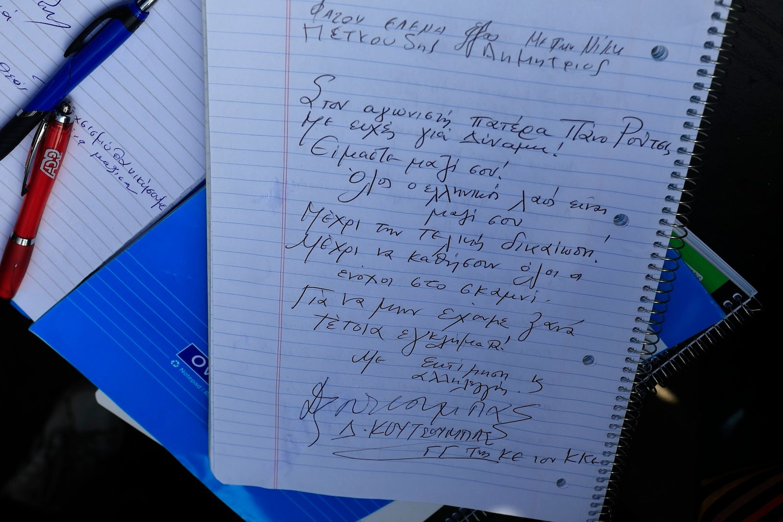 “Στον αγωνιστή πατέρα Πάνο Ρούτσι, με ευχές για δύναμη! Είμαστε μαζί σου! Όλος ο ελληνικός λαός είναι μαζί σου! Μέχρι την τελική δικαίωση! Μέχρι να καθίσουν όλοι οι ένοχοι στο σκαμνί! Για να μην έχουμε ξανά τέτοια εγκλήματα!”