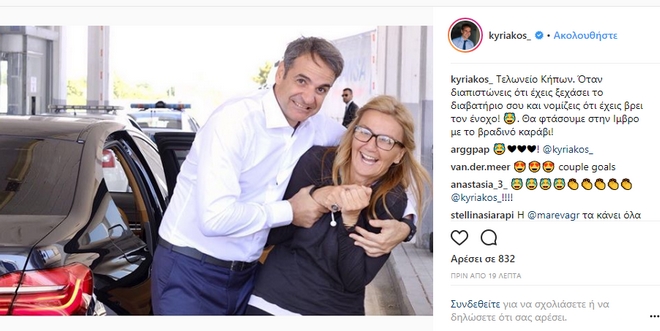 Ο κ. Μητσοτάκης έγραψε στο instagram αναρτώντας μια φωτογραφία με τη σύζυγό του Μαρέβα στα ελληνοτουρκικά σύνορα: «Τελωνείο Κήπων. Όταν διαπιστώνεις ότι έχεις ξεχάσει το διαβατήριο σου και νομίζεις ότι έχεις βρει τον ένοχο! ? Θα φτάσουμε στην Ιμβρο με το βραδινό καράβι!»