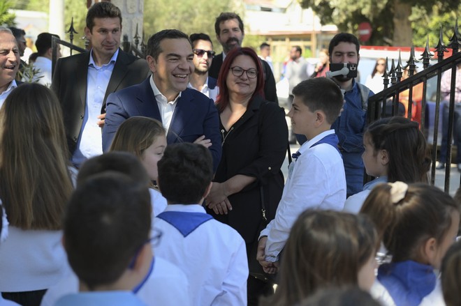 Μετά την παρέλαση ο κ. Τσίπρας έδωσε συγχαρητήρια στους μαθητές του Δημοτικού Σχολείου Τήλου και συνομίλησε για αρκετή ώρα μαζί τους.