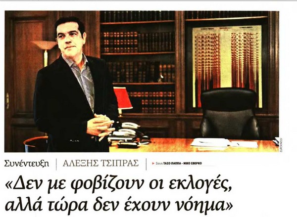 «Ούτε ένα ευρώ επιπλέον μέτρα» τιτλοφορείται η συνέντευξη του πρωθυπουργού Αλέξη Τσίπρα, προς την «Εφημερίδα των Συντακτών», ακριβώς δύο χρόνια από το βράδυ εκείνο που ο ΣΥΡΙΖΑ κέρδιζε τις εκλογές (για πρώτη φορά, γιατί ακολούθησε και δεύτερη εκλογική αναμέτρηση, εννέα μήνες μετά).