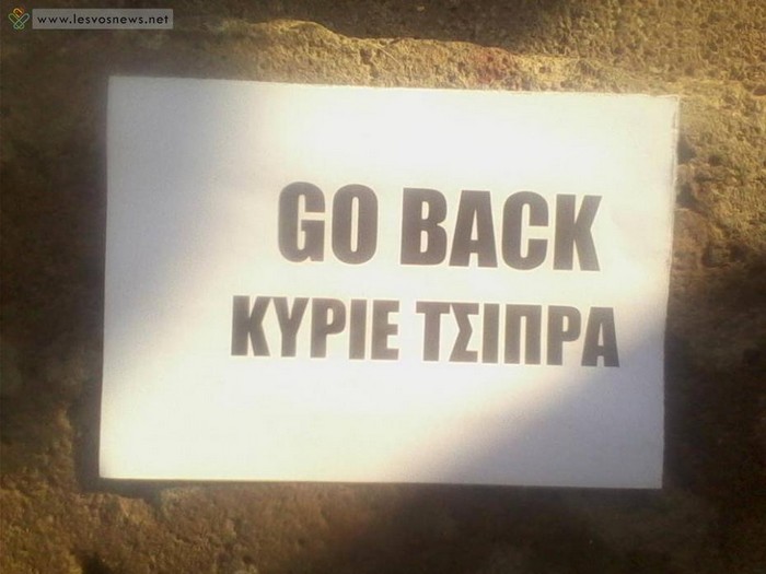 Με αφορμή την επίσκεψη ομάδα “αλληλέγγυων” κατέλαβαν το ιστορικό κτίριο της Μυτιλήνης και ανήρτησαν πανό διαμαρτυρόμενοι για την πολιτική Ελλάδας και Ευρώπης στο θέμα των προσφύγων. Το πανό ανέγραφε “γέμισε το αιγαίο κορμιά μεταναστών, είναι κι οι Ευρωπαίοι φονιάδες των λαών”. Οι καταληψίες πέταξαν και φέιγ βολάν τα οποία έγραφαν “Go Back κύριε Τσίπρα.