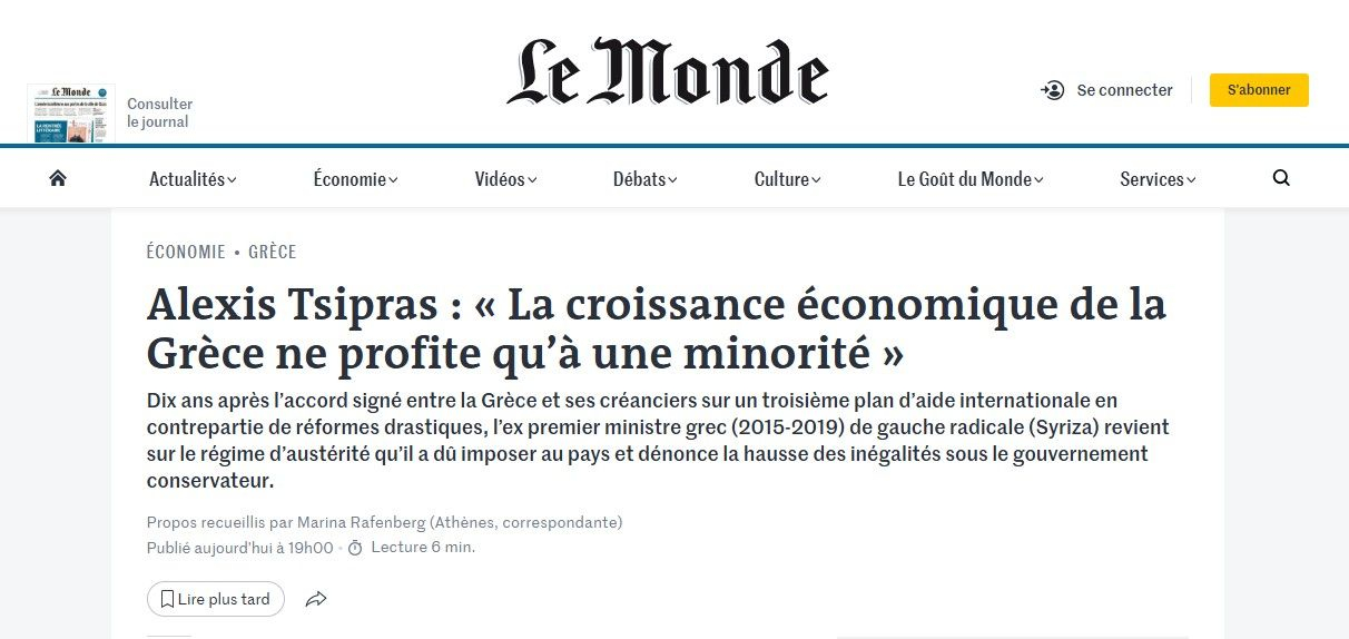 Όταν υποδέχτηκε την Le Monde την Πέμπτη 7 Αυγούστου στο γραφείο του στο κέντρο της Αθήνας, όπου μια βιογραφία του Πάπα Φραγκίσκου βρίσκεται δίπλα σε έναν σύγχρονο πίνακα με τα πρόσωπα του Τσε και του Φιντέλ Κάστρο, ο πρώην ηγέτης της Ριζοσπαστικής Αριστεράς (ΣΥΡΙΖΑ), ο οποίος έχει αποσυρθεί από την πολιτική σκηνή εδώ και αρκετούς μήνες, δήλωσε «περήφανος» που πήρε τη δύσκολη απόφαση να υπογράψει τη συμφωνία με τους πιστωτές το 2015, η οποία επέτρεψε στη χώρα να ανακτήσει την οικονομική της αυτονομία.